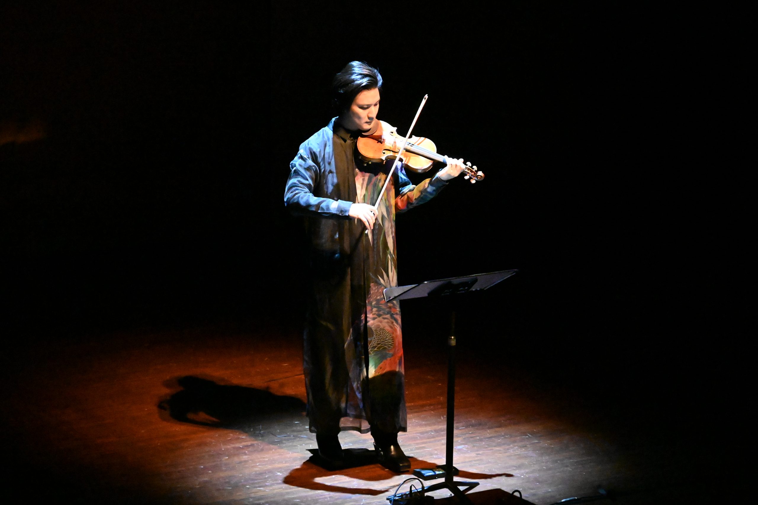 そして開演時間。暗転の中に響く足音の後に現れた成田さんが手にしているのは、ヴァイオリンの中でも最高峰と言われる“ストラディヴァリウス”。独特の緊張感が会場を包むと同時に、演奏が始まった途端の、半ば強引に、しかし至って自然に、mumyoの世界への扉が開かれました。ストラディヴァリウス×成田達輝の最高級の音色と、スピーカーから流れる音楽とも音とも声とも受け取れるようなサウンド。これらが融合したそれは“音楽”という一言で片付けてしまうには勿体無い、しかし別の言葉で表現するにはあまりに稚拙になってしまう……。これが、人々の心を惹きつけてやまない“mumyo”なのだということを全身で感じることができました。全11曲の中でも特に印象的だったのが、9曲目の暗転のなかで響くサウンドに重なって始まった10曲目の『BREAK-UP MANTRAS』。イギリスの作曲家であるベンノブトとの共同作品であるこの曲は、同じフレーズの反復とともに構成された約20分の大作。その反復が織りなす心の揺さぶりは、美しくも切なくもあり、彼らの『euphoria』が感じられる、素晴らしいものでした。そして、憂いの後にやってくる、どこか清々しい夜明けを感じさせるような曲『Rest in my friends,McDonald』で彼らの『euphoria』は終演となり、大きな拍手の渦に包まれていました。