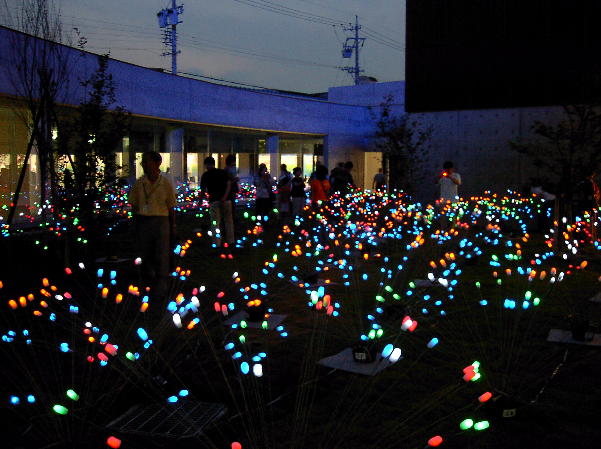 ホタルの柔らかい光をLEDにまゆ状の散光体をかぶせて作った光の芸術と、竹を利用した空間演出が、石作神社の境内を彩ります。