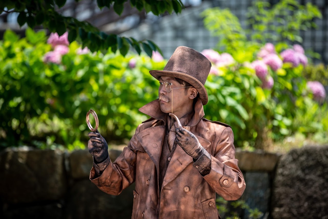 虫眼鏡とシャボン玉を使う人間銅像。俳優“塚越光”による交流型スタチュー。