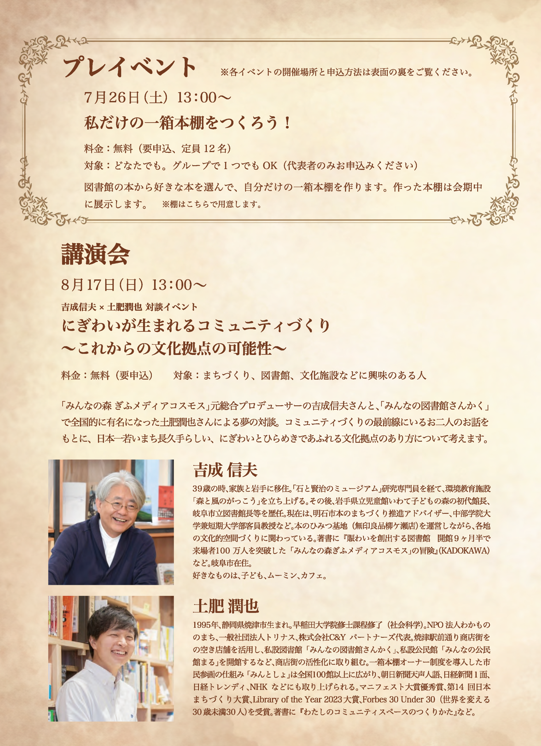 「みんなの森 ぎふメディアコスモス」元総合プロデューサーの吉成信夫さんと、「みんなの図書館さんかく」で全国的に有名になった土肥潤也さんによる夢の対談。