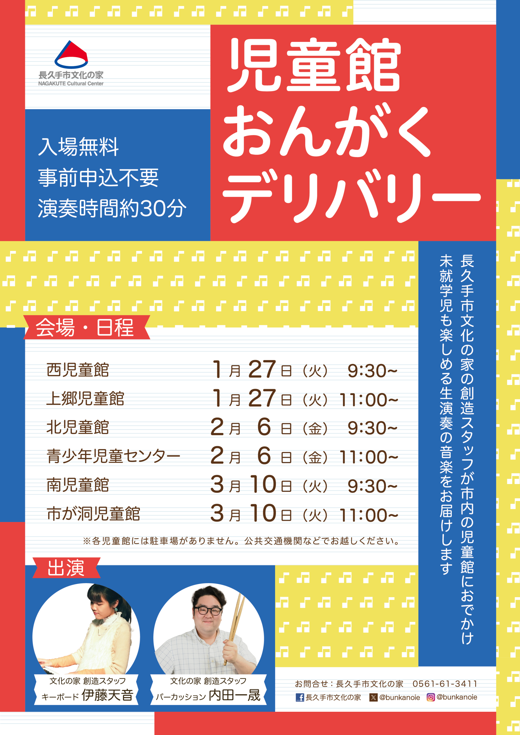 音楽系創造スタッフの伊藤天音(ピアノ)と内田一晟(パーカッション)が児童館に出向き、未就学児でも楽しめる演奏会を行います!